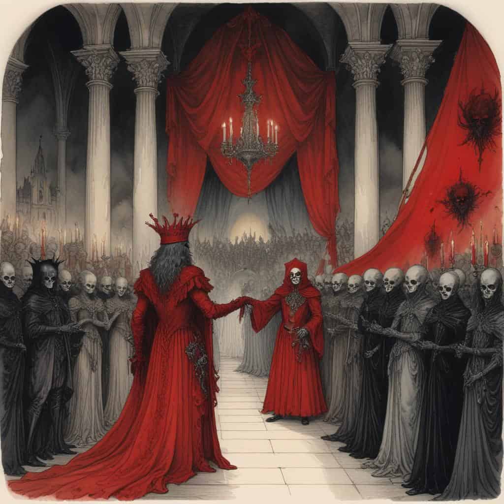 The apocalyptic imagery of the Red Death and the devastation it brings to the kingdom.