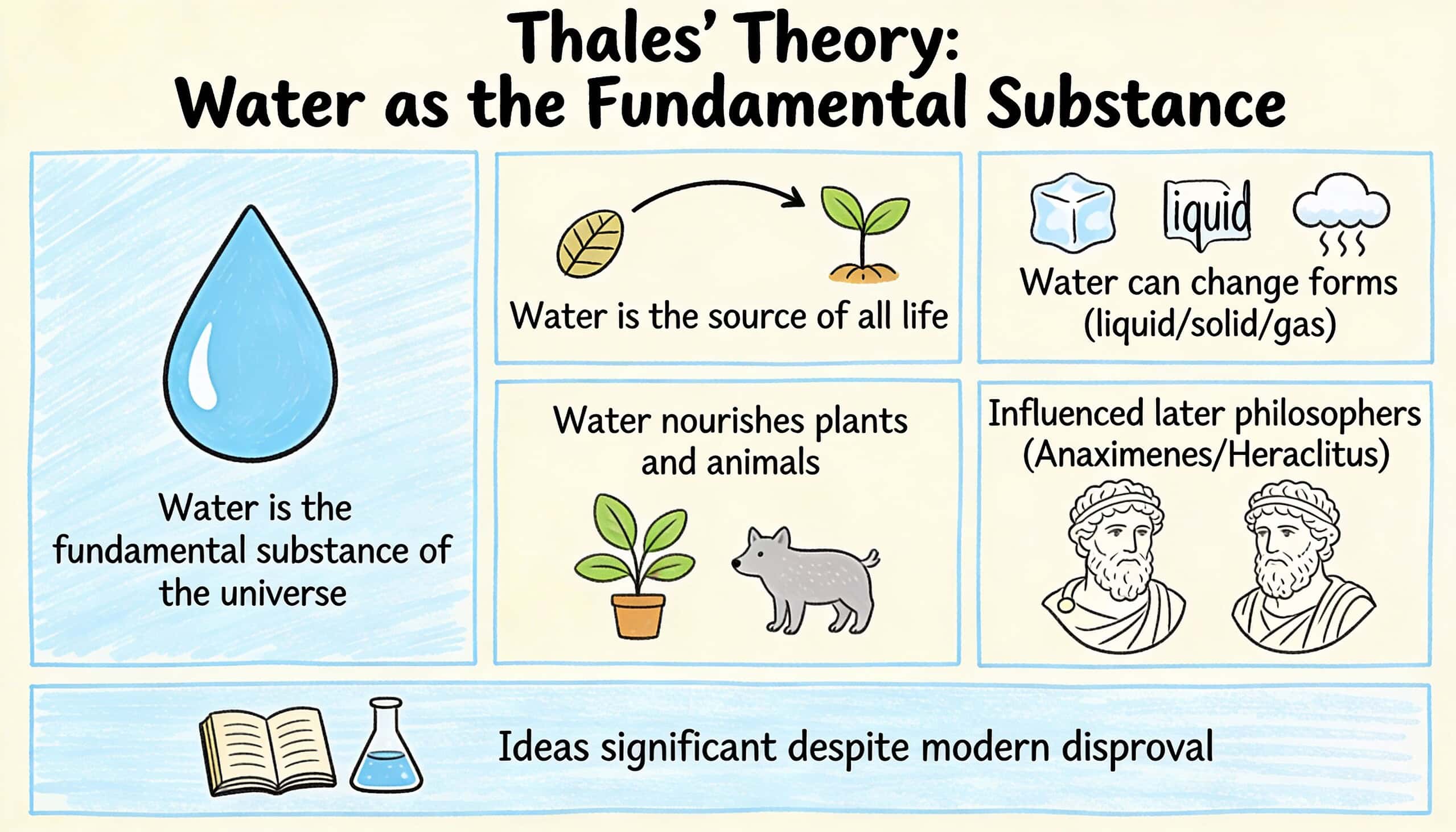 - Thales' concept of water as the source of all things paved the way for later scientific investigations into the nature of matter and the origins of the cosmos.